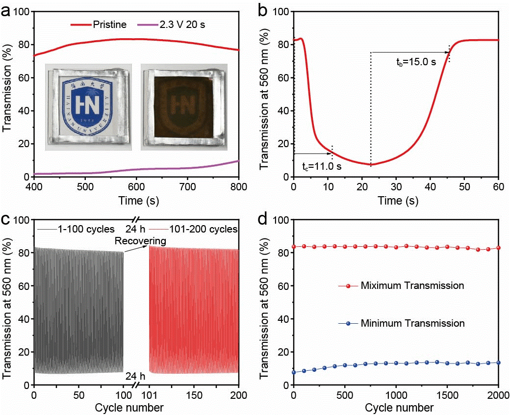 在大面积电致变色器件领域,实现均匀的电致变色调制一直是一个长期存在的挑战。太阳成集团tyc151cc王振副教授及其研究团队提出了一种基于非金属碘单质可逆电沉积的电致变色动态窗技术,研发出基于离子液体 MPII3 活性材料的 Zn-MPII3 电致变色电池。相关成果以“Electrochromism via reversible electrodeposition of solid iodine”为题,发表在《Nature Communications》期刊以及“Ionic Liquid MPII3 Elevates Electrochromic Battery Capacity to Practical Applications”为题发表于《Advanced Materials》期刊上。研究采用含碘离子的盐包水电解液(29.5 m ZnCl2 + 0.5 m ZnI2),凭借其独特的电解液环境及其溶剂化结构,有效抑制了单质碘的溶解与穿梭效应,进而开辟了一条不同于传统电解液的反应路径。通过这一路径,成功实现了碘单质与溶剂化碘离子之间的可逆固-液相(I2/I-)转化,从而实现了稳定且可逆的碘电沉积与溶解过程。基于碘单质电沉积的电致变色器件表现出了高达76.0%的优异光学调制率,并能够实现接近色中性的着色状态。此外,器件还具备自愈功能,其褪色态的透过率可通过静置恢复至初始水平,有效延长器件的使用寿命。研究为电致变色电池领域发展开拓了新思路,彰显了离子液体在该领域的潜在应用价值,也为电致变色电池在可供电智能窗、节能建筑等领域的实际落地提供了重要参考。