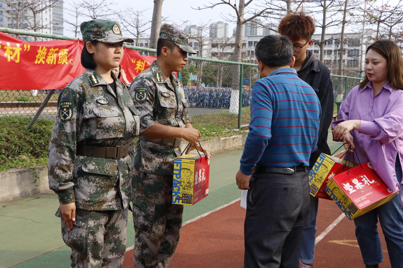 胡先文书记代表公司向军训教官送上慰问物资并表达了对十三中队教官的高度肯定和赞扬,希望三位教官在后续的军训中,高标准、严要求,训出水平、训出风采。