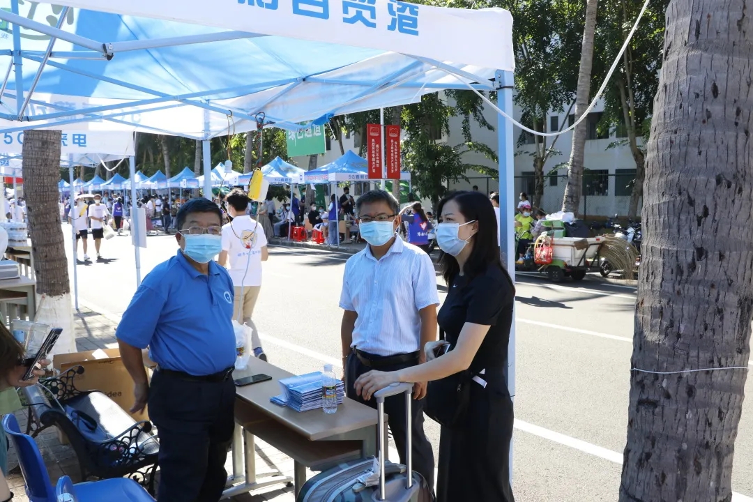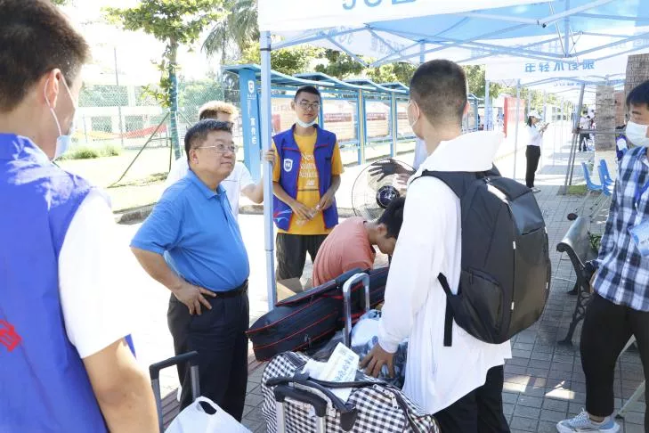 为贯彻落实国家和海大疫情防控要求,稳慎做好海大开学工作,切实维护广大新生身体健康和生命安全,符宣国书记、骆清铭董事长带队来到迎新大本营慰问迎新工作人员,询问迎新的具体情况,肯定了公司对新生报到数据的精准掌握。