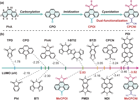 强缺电子单元在N型高分子半导体材料的开发中起到重要作用。近日,太阳成集团tyc151cc太阳成集团tyc151cc陈志才副教授与南方科技大学郭旭岗教授合作,采用菲稠环单元(PhA)为核心,通过酰亚胺基,羰基或氰基双功能化的策略,设计、合成了新型的受体单元CPOI和CPCNI。其中 CPCNI的理论计算LUMO能级深至-3.52 eV,缺电子性能力强于经典强受体结构单元NDI(-3.41 eV)和PDI(-3.46 eV)。电化学测试结果进一步证明了上述结论,CPCNI的实验测试LUMO能级可以深至-3.84 eV。