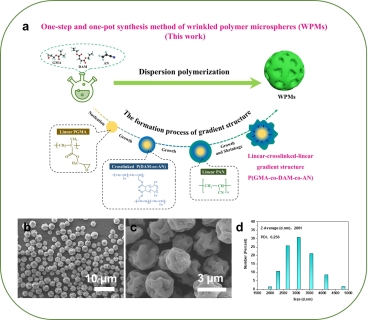 褶皱聚合物微球因其丰富且可调节的表面微结构而被广泛应用于微流控芯片、生物医学和功能材料领域。然而,迄今为止,如何简单高效地制备褶皱聚合物微球仍是一大挑战。现有的褶皱聚合物微球合成方法主要包括种子聚合法、溶剂蒸发法、相分离法和模板法等,普遍存在操作复杂、耗时长的问题,大大限制了褶皱微球的规模化制备生产。与传统的多步合成法不同,本研究首次提出了一种基于单体竞聚率差异的一步一锅法用于合成具有线性-交联-线性梯度结构的褶皱聚合物微球,通过选取具有不同竞聚率的乙烯基单体进行分散聚合,微球从内部到外部逐步形成线性-交联-线性梯度结构,这种梯度结构的应力差异导致微球产生不均匀收缩形成表面褶皱,进而得到具有良好的均匀性的褶皱聚合物微球。同时,该方法具有通用性,可用于制备不同组成、粒径或褶皱程度的聚合物微球。最后,通过在合成过程中分别加入荧光染料制备出了具有蓝色发射和橙色发射的两种褶皱荧光微球,证明了它们作为荧光载体的潜力。这项工作不仅为褶皱聚合物微球的简易合成提供了新的视角,也证明其在制备功能材料方面具有广阔的应用前景。