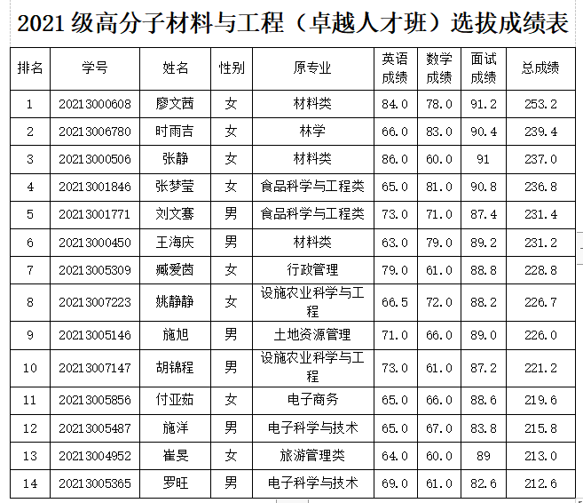根据太阳成集团tyc151cc《关于做好 2021 级普通本科特色班级选拔工作的通知》(海大教[2022]5号)和《关于开展 2021 级特色班级招生选拔二次志愿征集工作的通知》(海大教[2022]19号)文件精神,由员工本人自愿报名,经过英语、数学考试和面试等环节,在政治思想、身体状况满足条件的前提下,按英语+数学+面试的总成绩由高到低排序,择优录取14名同学,组建2021级高分子材料与工程卓越人才班。