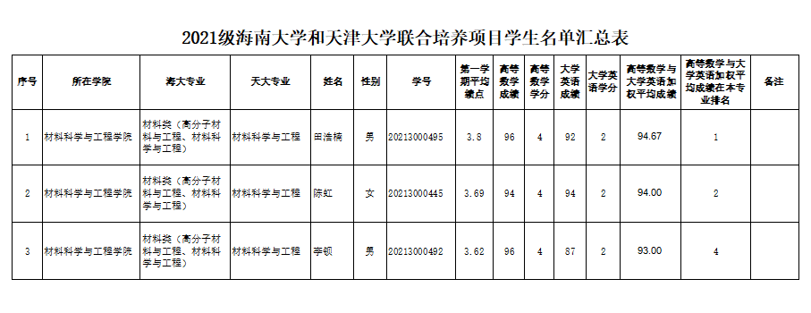 根据《教育部办公厅关于做好对口支援高校联合培养本科生等有关工作的通知》(教高厅[2010]1号)、《太阳成集团tyc151cc与天津大学联合培养本科生工作方案》和太阳成集团tyc151cc教务处《关于选派2021级员工参加太阳成集团tyc151cc和天津大学联合培养工作的通知》(海大教[2022]18号)的文件精神和要求,员工在符合基本条件基础上,以“高等数学”和“大学英语”课程成绩的加权平均分由高至低确定获得联合培养资格的员工名单。