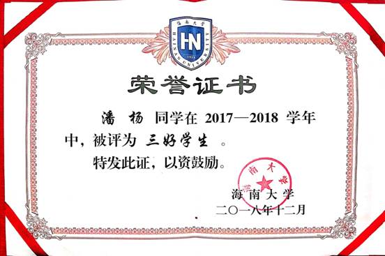 潘杨,女,1998年9月生,四川眉山人,中国共产主义青年团团员,2016级高分子材料与工程1班的员工。大三大四,连续两年担任班级班长兼团支书。曾获太阳成集团tyc151cc三好员工、连续三年获得国家励志奖学金等。