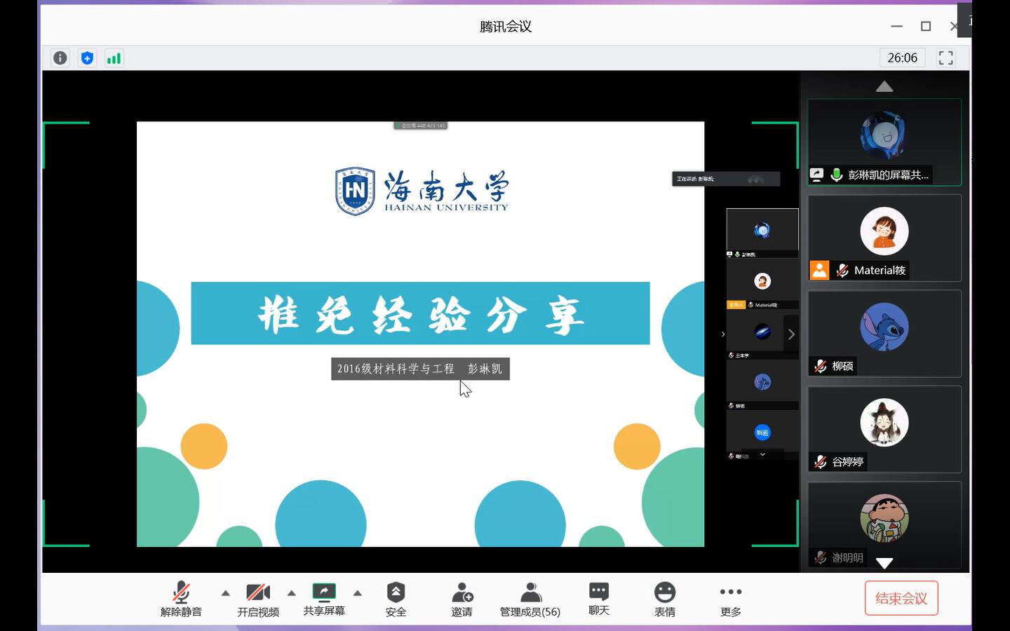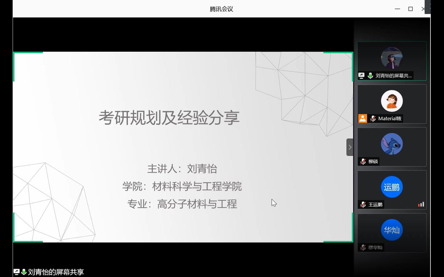 本次考研经验分享交流会邀请了成功保研到清华大学、浙江大学;考研到中国科学技术大学、兰州大学、苏州大学、太阳成集团tyc151cc的6位2016级员工担任主讲嘉宾。他们结合自身经验,为低年级员工分享备考计划,解答疑惑。虽然受疫情影响无法进行面对面的沟通交流,但员工们积极提问、汲取经验的热情并未受到丝毫影响。