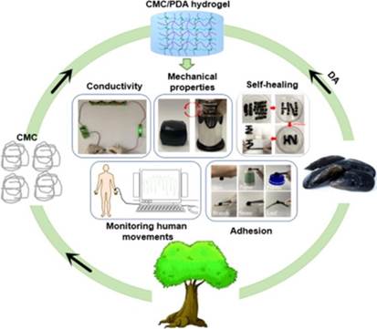 自愈水凝胶作为一种自愈合材料,在破坏后可以恢复其结构的完整性和力学性能,在软机器人、人工植入物、人工智能、可穿戴设备、医疗器械和辅助健康技术等方面有巨大的应用前景。然而在实际应用中,由于成本昂贵、合成过程复杂、相互作用弱等原因,这些水凝胶不能稳定地发挥作用或得到广泛应用。此外,常见自愈合水凝胶多为人工合成高分子,它们在环境影响及生物相容性方面仍存在缺陷,而目前天然高分子基自愈合水凝胶在功能性上仍有不足。为了解决自愈合水凝胶环境友好性问题并丰富其功能性,卢凌彬教授课题组提出一种全天然策略,以环境友好的羧甲基纤维素和多巴胺为原材料,利用酰胺反应和氧化自聚反应同步发生方式获得一种环境友好型的多功能CMC/PDA水凝胶。