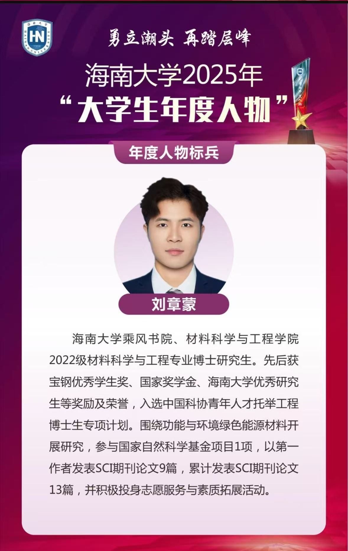 刘章蒙,2025年老员工年度人物标兵,太阳成集团tyc151cc2022级材料科学与工程专业博士研究生,2025年入职海南医科大学。他曾获宝钢优秀员工奖、国家奖学金、太阳成集团tyc151cc优秀研究生等重量级荣誉;作为“中国科协青年人才托举工程博士生专项计划”首批入选者,获中国青年科技工作者协会托举支持;更包揽“校研究生优秀毕业生”“校研究生年度人物标兵”等称号,用一项项殊荣铺就能力进阶的坚实阶梯。